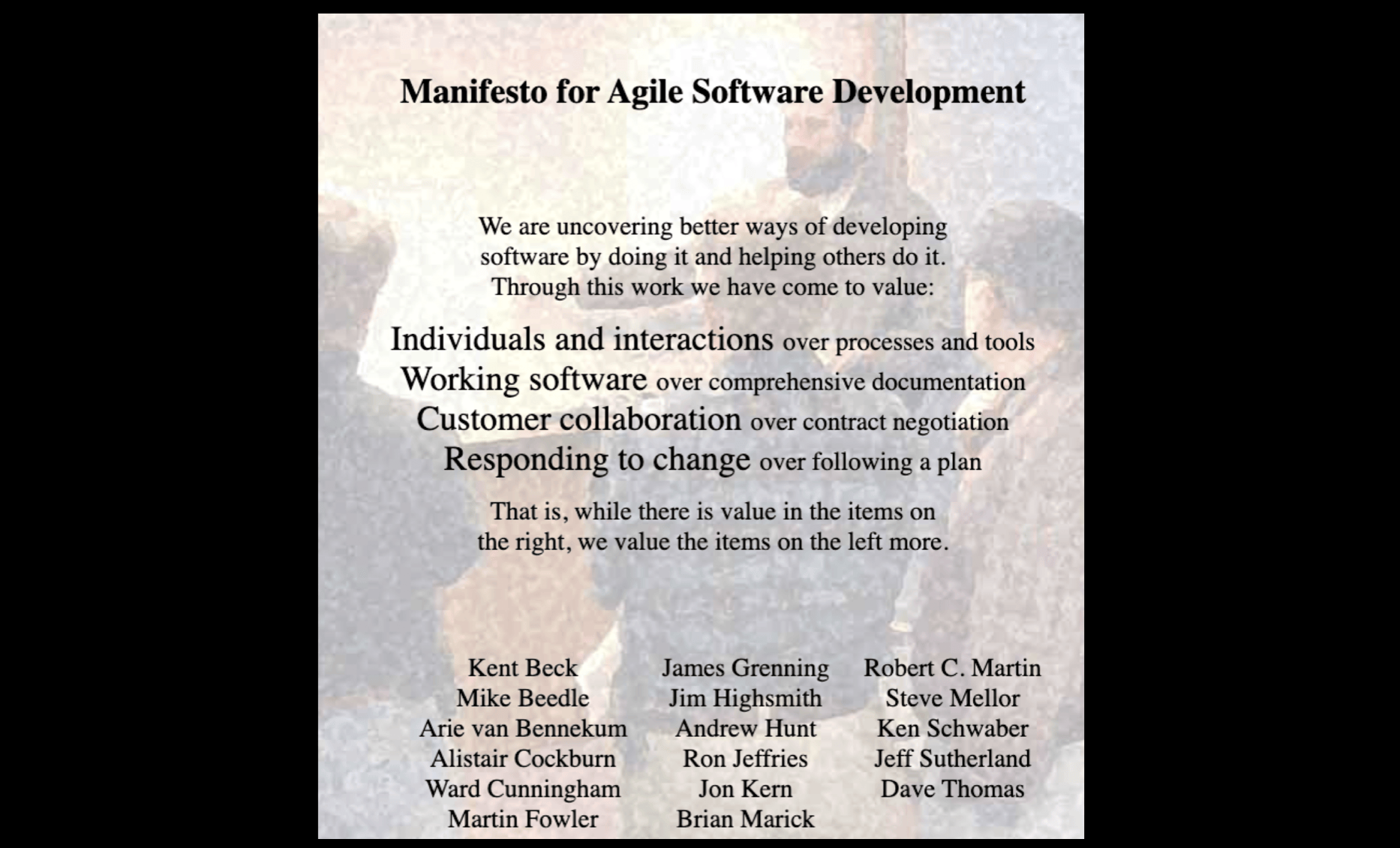 Finalmente, ya hacia la década que inaugura el año 2000 se publica el famoso Manifesto for Agile Software Development, con la firma de relevantes programadores. Sabemos, por lo tanto, que los distintos enfoques y formas de trabajar con el software nacían de las mismas personas que mejor lo conocían. En este momento, los tiempos y los costes han desaparecido ya por completo como principales objetivos, y en su lugar cogen protagonismo, entre otros, la colaboración con los clientes y la capacidad para responder al cambio.