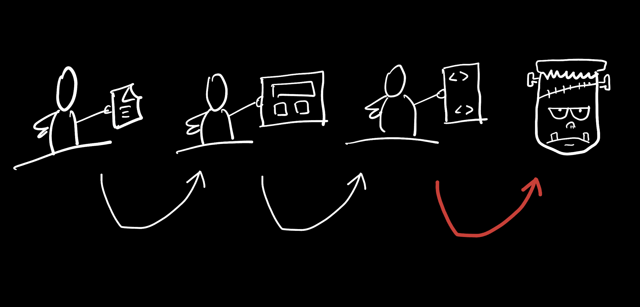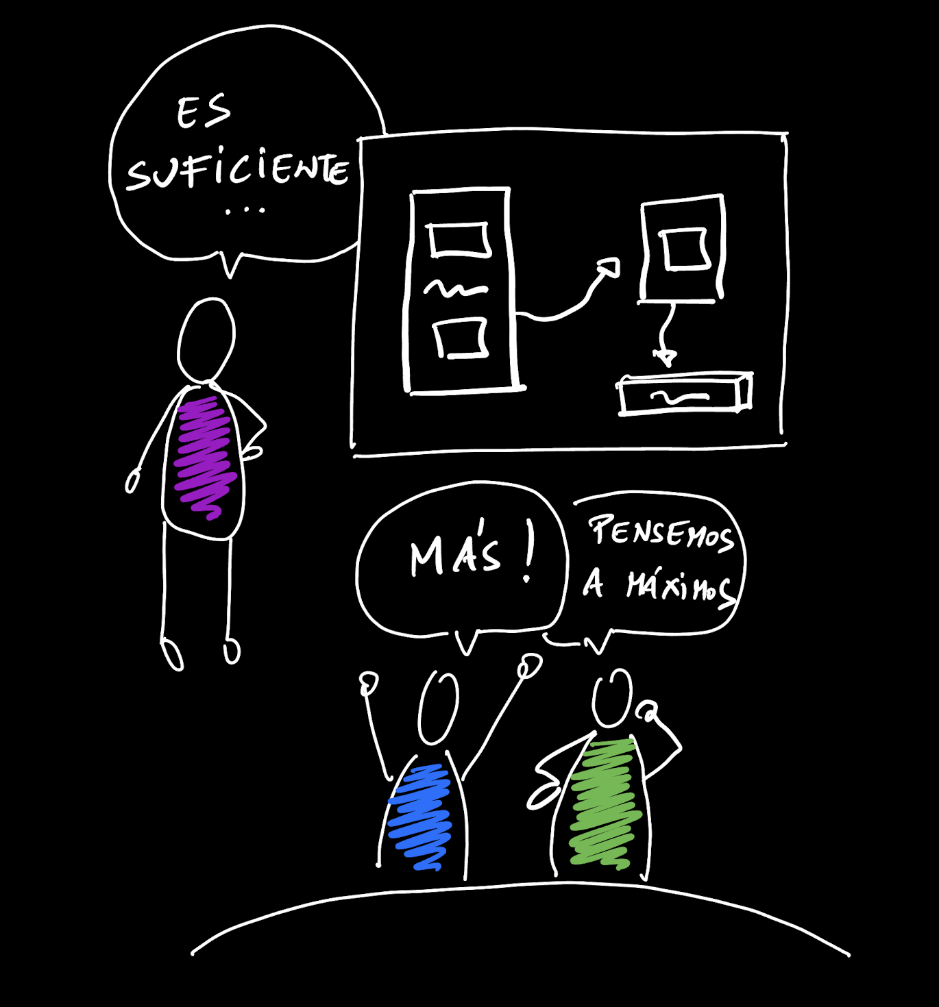 En primer lugar, a este tipo de compañías les sienta mal inventar a partir de proyecciones de alta fidelidad. Si el Figma es el punto de partida y además alguien lo valida, ya sea el CEO -algo todavía más común de lo que suele pensarse- o cualquier otra figura directiva, es muy alto el peligro de deslizarse por la pendiente de desarrollos que parecen no tener fin. Igualmente, el riesgo de tener poca velocidad (a veces la discusión queda secuestrada en el propio Figma). Asimismo, tendrá que apuntarse en el debe mucha frustración y pérdida de talento en sus equipos, puesto que ese resultado final, proyección de ese diseño a máximos en alta fidelidad, nunca podrá alcanzarse tal como se imagina, porque como hemos visto no existe esa correspondencia unívoca entre entrada y salida.